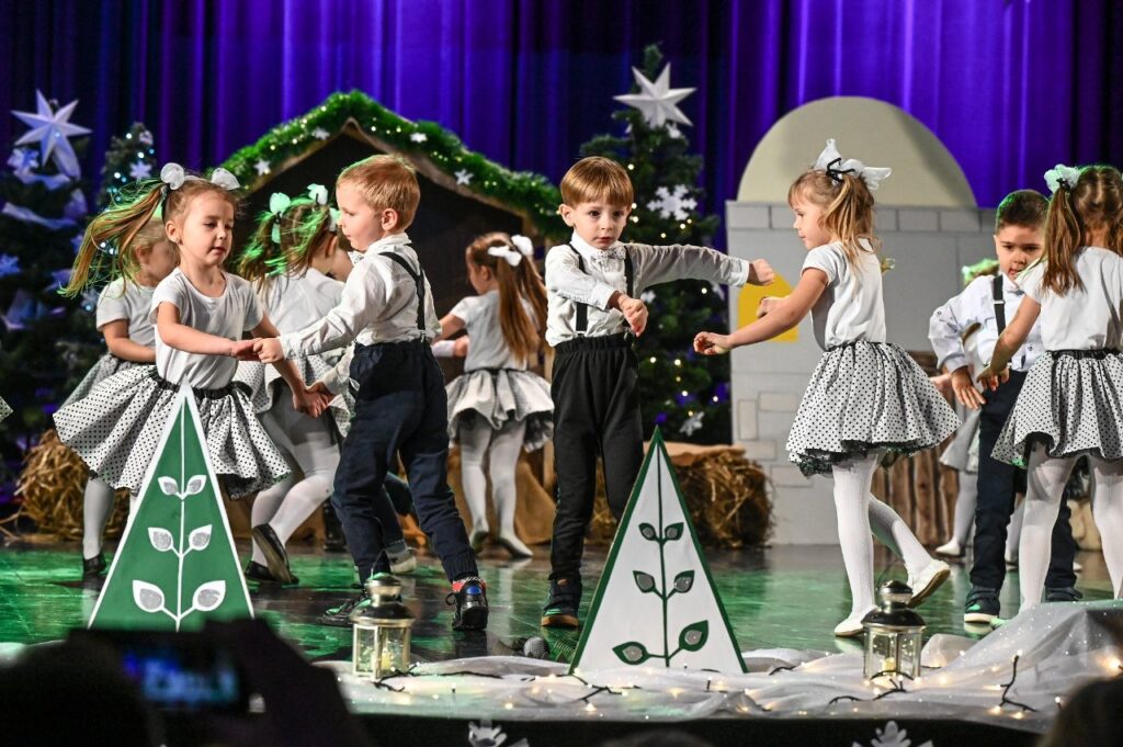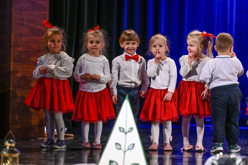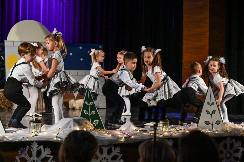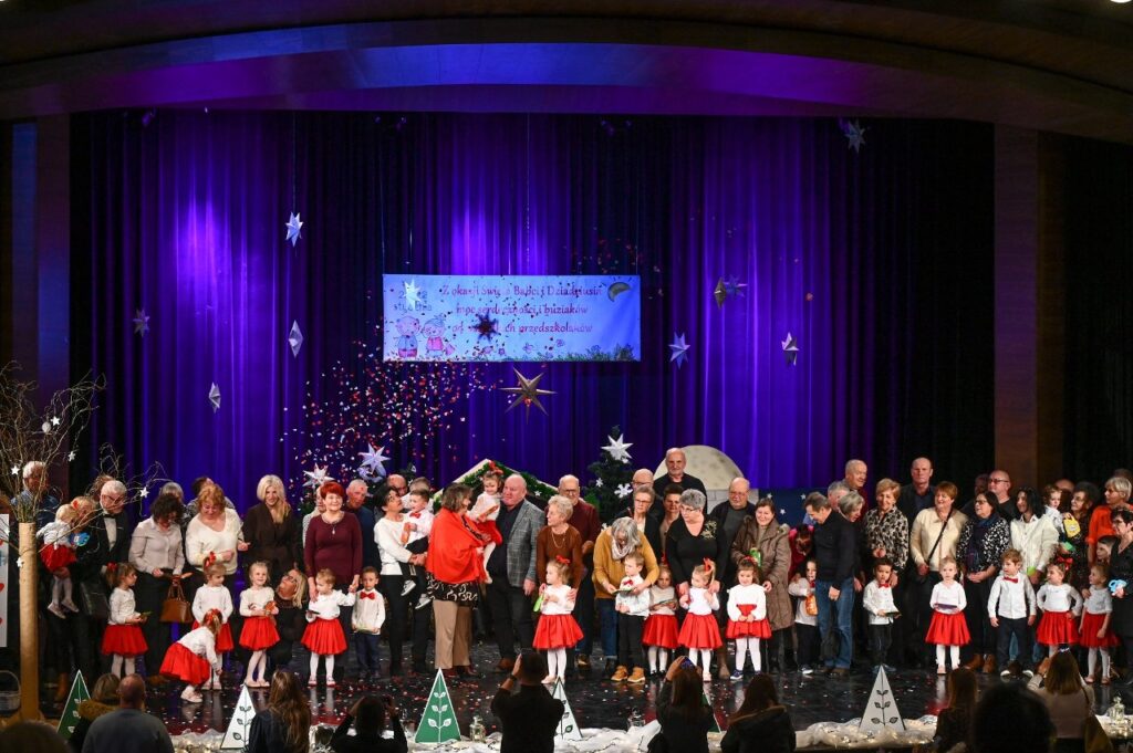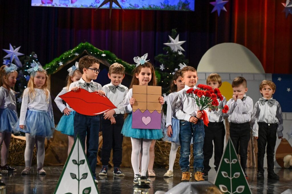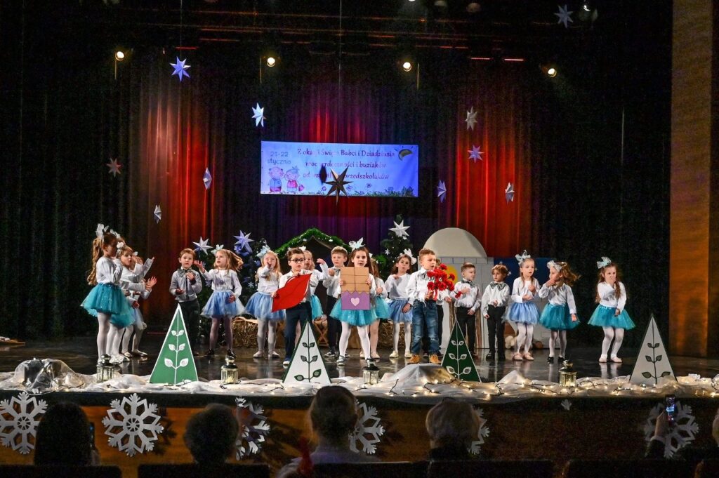 Jako pierwsza zaprezentowała się najmłodsza grupa przedszkolna – Misie, która zaśpiewała skoczną i radosną poleczkę. Motyle wykonały energiczny, pełen radości taniec w rytmie rock and rolla do piosenki ,, Wesoła gromadka’’. Krasnale inscenizowały piosenkę pełną buziaków i serdecznych życzeń dla ,, Babci i Dziadka’’. Dzieci z grupy Sówki i gościnnie Krasnali zaprezentowały swoim gościom Jasełka pod hasłem ,,Z sercem i tradycją przy żłóbku’’. Przedstawienie świąteczne było okazją aby wprowadzić widzów w magiczny i pełen ciepła klimat, przypominając o istocie świąt poprzez opowieść o narodzinach Jezusa. Dzieci dały z siebie wszystko i bardzo się starały wypaść jak najlepiej przed tak ważną dla nich publicznością. Występ dostarczył wielu wzruszeń i został nagrodzony gromkimi brawami. Niejedna babcia i dziadek ukradkiem ocierali łezkę wzruszenia, wywołaną widokiem przebranych za aniołki i pastuszków wnucząt…