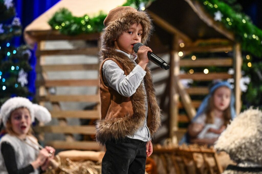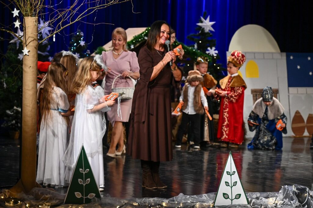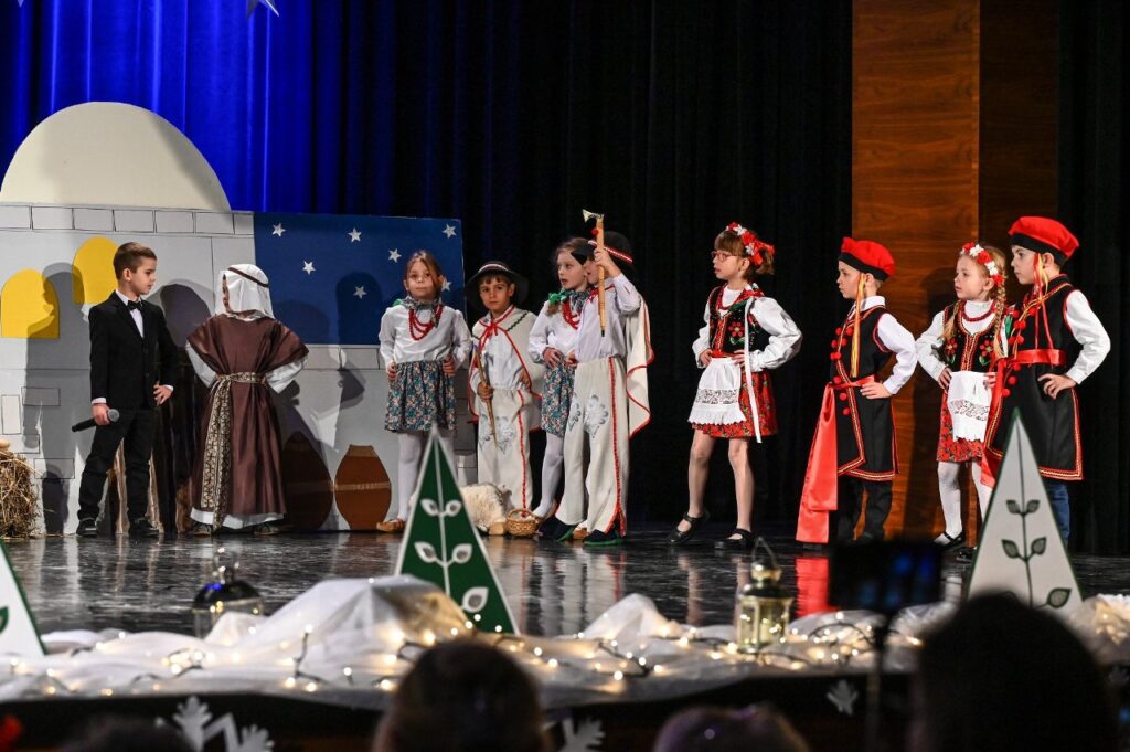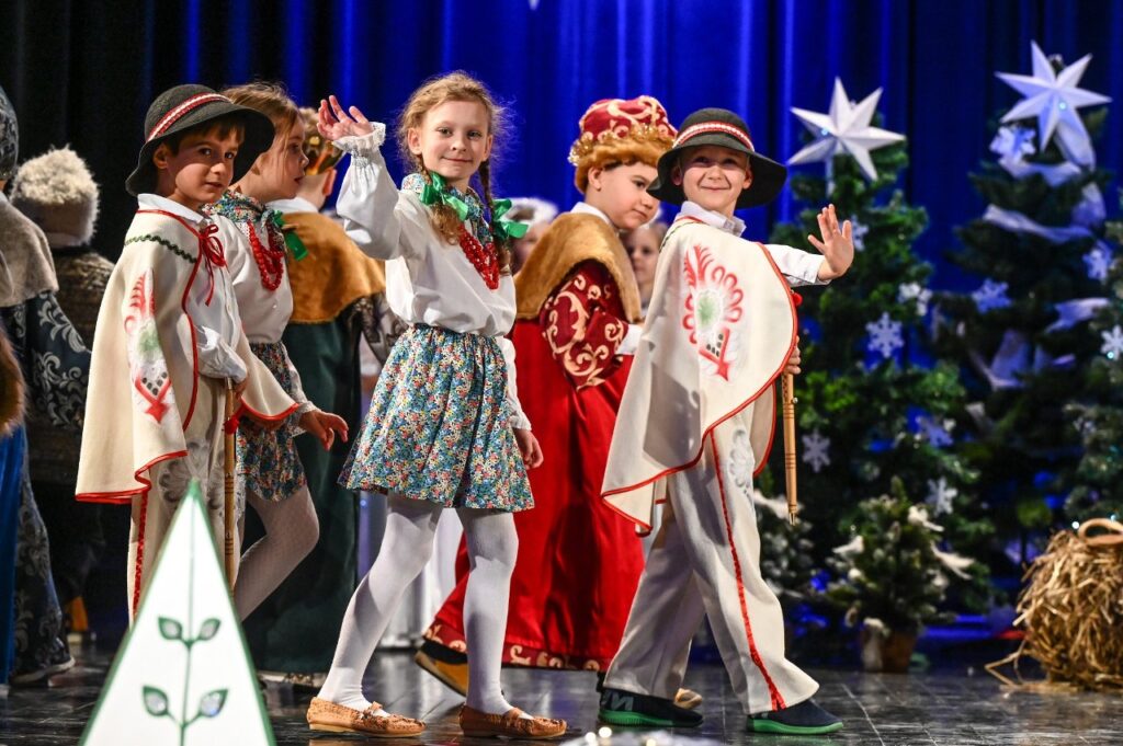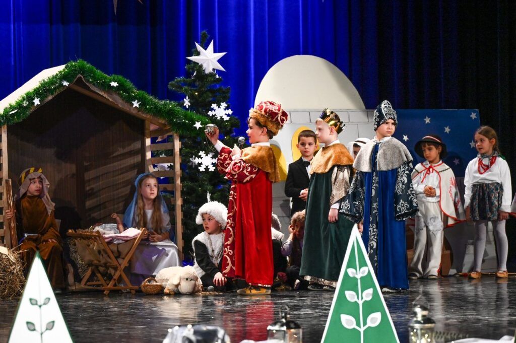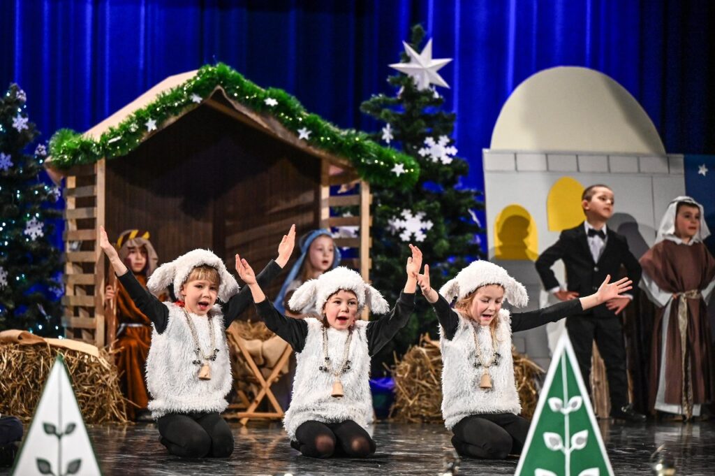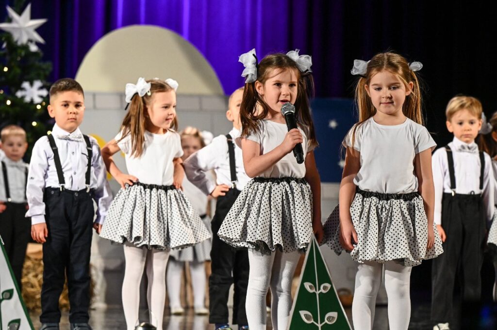 Jako pierwsza zaprezentowała się najmłodsza grupa przedszkolna – Misie, która zaśpiewała skoczną i radosną poleczkę. Motyle wykonały energiczny, pełen radości taniec w rytmie rock and rolla do piosenki ,, Wesoła gromadka’’. Krasnale inscenizowały piosenkę pełną buziaków i serdecznych życzeń dla ,, Babci i Dziadka’’. Dzieci z grupy Sówki i gościnnie Krasnali zaprezentowały swoim gościom Jasełka pod hasłem ,,Z sercem i tradycją przy żłóbku’’. Przedstawienie świąteczne było okazją aby wprowadzić widzów w magiczny i pełen ciepła klimat, przypominając o istocie świąt poprzez opowieść o narodzinach Jezusa. Dzieci dały z siebie wszystko i bardzo się starały wypaść jak najlepiej przed tak ważną dla nich publicznością. Występ dostarczył wielu wzruszeń i został nagrodzony gromkimi brawami. Niejedna babcia i dziadek ukradkiem ocierali łezkę wzruszenia, wywołaną widokiem przebranych za aniołki i pastuszków wnucząt…