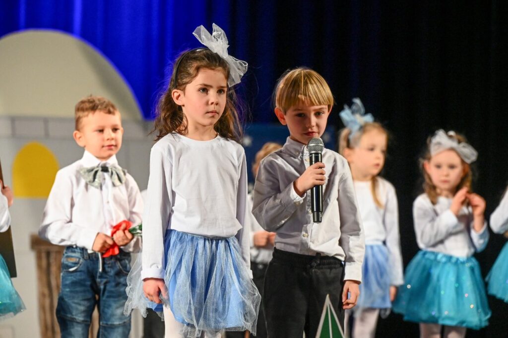 Następnie rozpoczęła się część artystyczna w wykonaniu przedszkolaków. Dzieci ze wszystkich grup wiekowych prezentowały na scenie swoje umiejętności wokalne, taneczne i aktorskie.