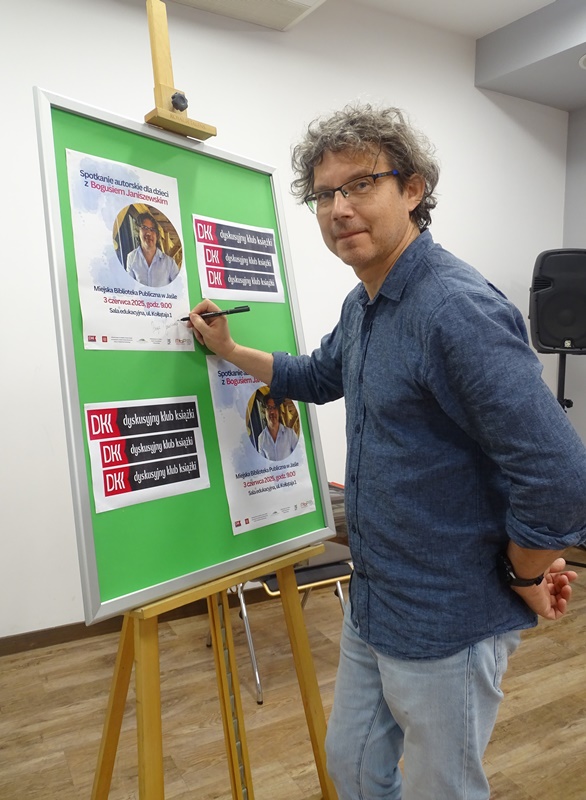 3 czerwca 2025 r. w Miejskiej Bibliotece Publicznej w Jaśle w ramach XXIV Ogólnopolskiego Tygodnia Czytania Dzieciom, odbyło się spotkanie z Bogusiem Janiszewskim – autorem licznych, popularnonaukowych książek dla dzieci i młodzieży, stworzonych wspólnie z ilustratorem Maksem Skorwiderem i ilustratorką Nikolą Kucharską. W spotkaniu wzięli udział uczniowie kl. II i III z Zespołu Szkół Miejskich nr 1 w Jaśle. Autor opowiadał o swoich książkach, skupiając się m.in. na tytule pt. „Ekonomia. To, o czym dorośli ci nie mówią”, którą napisał z myślą o swoim synu Stasiu. Wyjaśnił, że publikacja ta ma na celu przybliżenie młodemu czytelnikowi skomplikowanych zagadnień ekonomicznych w przystępny i zrozumiały sposób, aby mógł lepiej zrozumieć świat finansów i gospodarki. Następnie przedstawił bohatera kolejnej serii książek – Antka, chłopca, który miał trudności z zaśnięciem oraz jego niezwykłego przyjaciela spod łóżka Kurzola. Ta niezwykła przyjaźń ma za zadanie pomagać młodym czytelnikom zrozumieć, jak działa organizm ludzki. Autor, posługując się rekwizytami w ciekawy i zrozumiały sposób wyjaśnił dzieciom, jak funkcjonują jelita, żołądek, przełyk oraz mózg. Dzięki temu młodzi słuchacze mogli lepiej zrozumieć skomplikowane procesy zachodzące w ich ciele, a nauka stała się dla nich zarówno pouczająca, jak i zabawna.