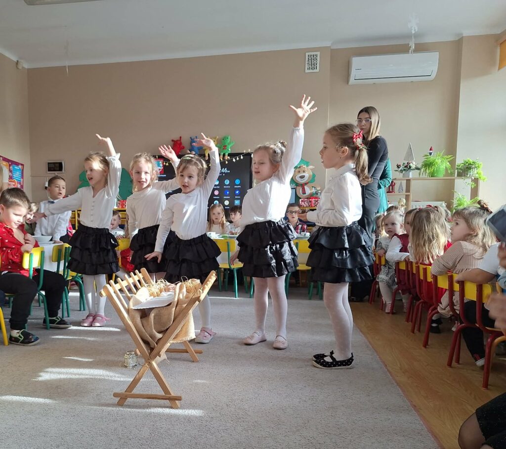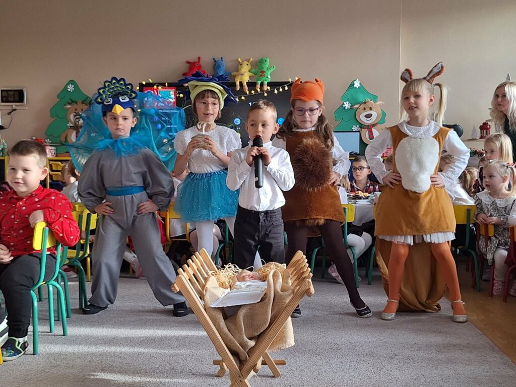 Uroczystość rozpoczęła pani dyrektor Elżbieta Krzysiak, która serdecznie powitała wszystkich zebranych oraz złożyła świąteczne życzenia gościom, dzieciom, rodzicom i pracownikom przedszkola. Następnie dzieci z grup „Krasnale” i „Sówki” zaprezentowały piękny program artystyczny. Mali artyści zaśpiewali i zatańczyli do pastorałek: „ Ptaki, niby dzwoneczki” oraz „ Z radością w serduszku”, wprowadzając wszystkich w radosny, uroczysty i pełen magii świąteczny nastrój. Dzieci złożyły również serdeczne życzenia, które wzruszyły zgromadzonych gości.