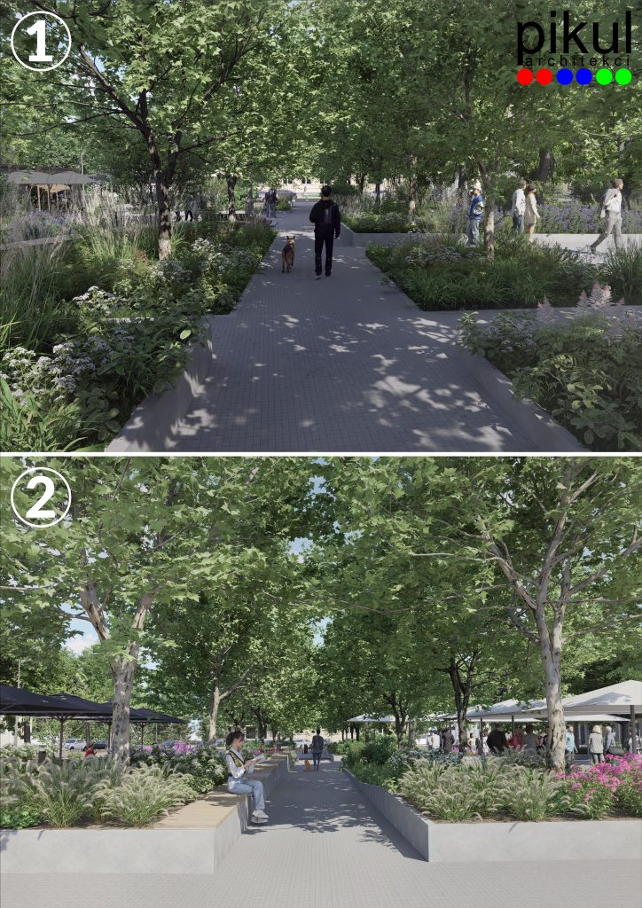 Tak jak w przypadku zachodniej pierzei rynku, projektant opracował dwa warianty przebudowy wschodniej części placu. Obydwie koncepcje zakładają zwiększenie powierzchni biologicznie czynnej w obrębie wschodniej części rynku, z uwzględnieniem nowych nasadzeń. Oznacza to, że w sercu naszego miasta pojawi się zdecydowanie więcej zieleni. Zwiększenie powierzchni przepuszczalnych wpłynie pozytywnie zarówno na poprawę retencji wód opadowych, jak też warunki bytowania drzew, które rosną w tej części rynku. Żadne z nich nie zostanie usunięte w związku z realizacją przedsięwzięcia.
