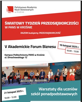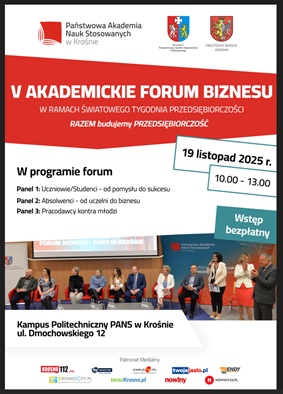 Serdecznie zapraszamy na V Akademickie Forum Biznesu, które w tym roku odbywa się w ramach Światowego Tygodnia Przedsiębiorczości (17–23 listopada 2025 r.) pod hasłem „Razem BUDUJEMY Przedsiębiorczość”.