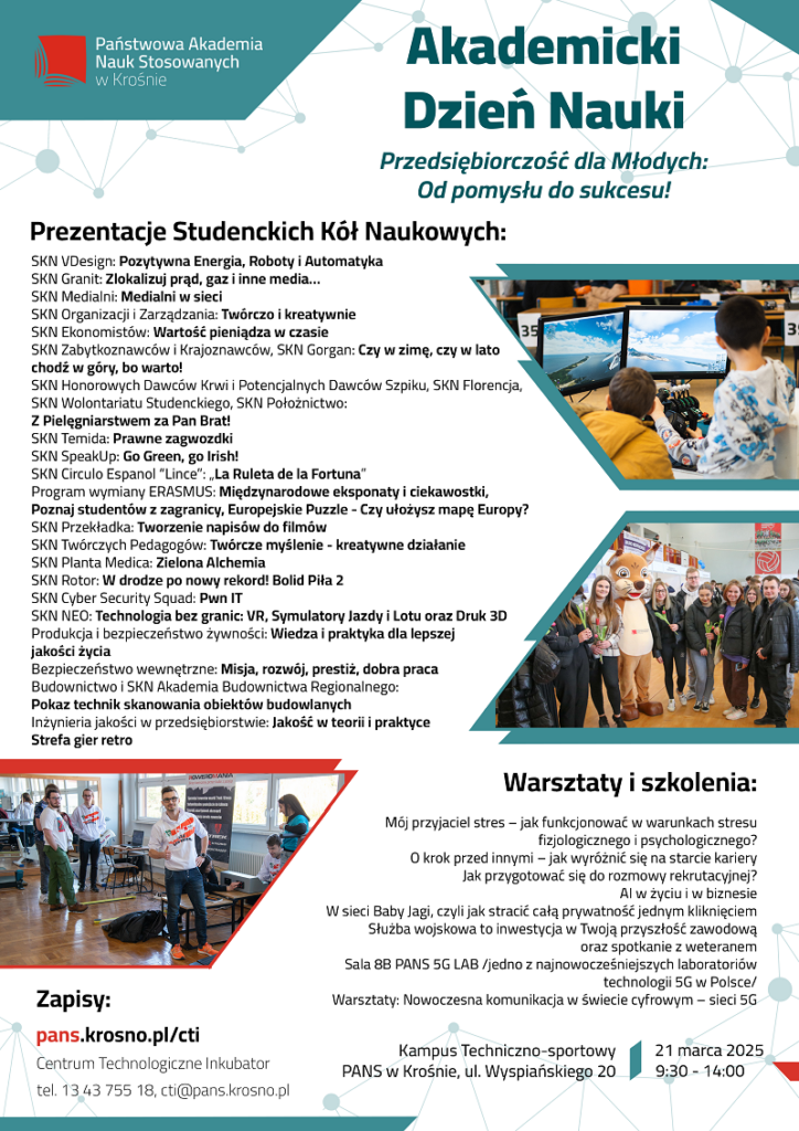 Akademicki Dzień Nauki to wyjątkowe spotkanie z nauką i nowoczesnymi technologiami, które zaprezentują studenci działający w Studenckich Kołach Naukowych oraz nauczyciele akademiccy PANS w Krośnie. Wydarzenie skierowane jest do uczniów szkół ponadpodstawowych i oferuje udział w warsztatach, szkoleniach, konkursach oraz inspirujących prezentacjach.