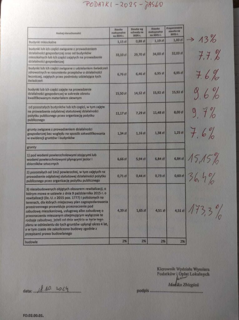 Na ostatniej sesji Rady Miejskiej Jasła, na wniosek pana Burmistrza, koalicja rządząca w mieście – Odnowa oraz PO – wsparta dwoma radnymi spoza kolacji rządzącej, podjęli decyzje o podwyżce podatków od nieruchomości. W lokalnych mediach pokazała się informacja trochę zmanipulowana, że kwoty, które podjęła Rada są niskie, wręcz prawie minimalne. W załączniku pokazujemy Państwu stan faktyczny, uważamy, że sami przemyślicie to, co jest stanem faktycznym. Proszę przy tym pamiętać, że inflację liczy się procentowo a nie kwotowo. Na czerwono z boku tabeli podajemy procentową podwyżkę podatków przy inflacji 2.7%